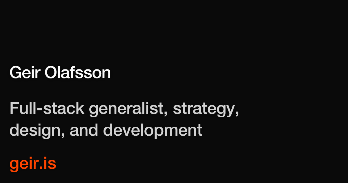 /og?title=Geir+Olafsson&description=Full-stack+generalist%2C+strategy%2C+design%2C+and+developmentWith background image