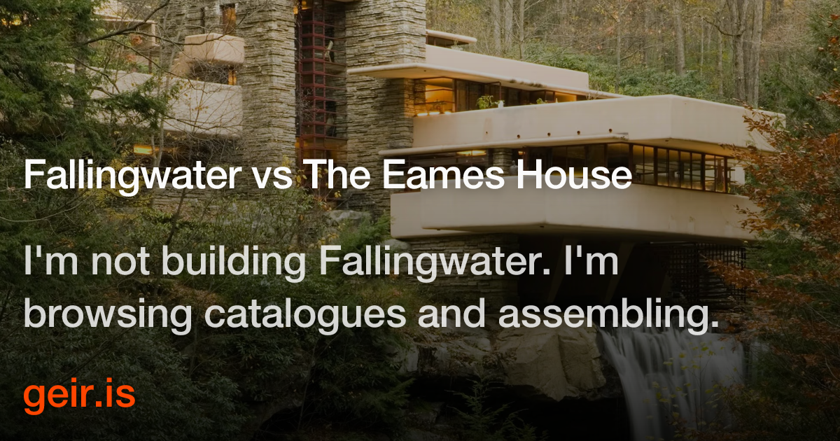 /og?title=Fallingwater+vs+The+Eames+House&description=I%27m+not+building+Fallingwater.+I%27m+browsing+catalogues+and+assembling.&image=https%3A%2F%2Fve7o52t8ra.ufs.sh%2Ff%2FHDca0BEpV67XktcjUoqeDsGKUNcuhOxwmCEQd1Ta39XonYMygood-things-come-to-those-who-wait